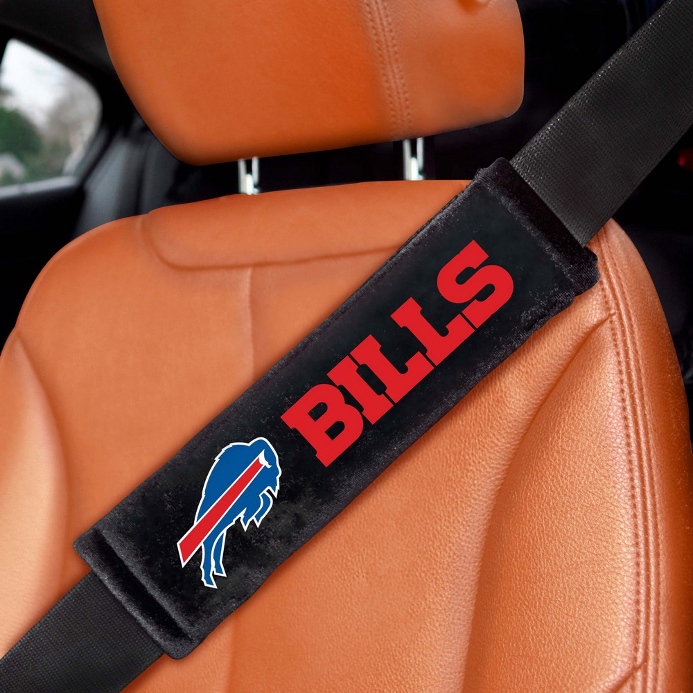 | Buffalo Bills Embroidered Seatbelt Pad - 2 Pieces Constructed of soft velour Durable embroidered logo and team name on each pad Universal size is suitable for any shoulder strap Plush padding for added support and comfort Can also be used for luggage, gym bags or messenger bags Officially Licensed NFL - Buffalo Bills in New York NFL National Football League |
