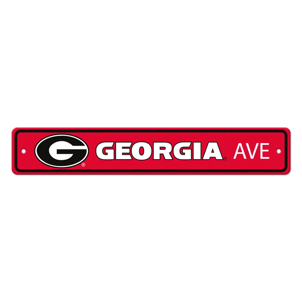 | Georgia Bulldogs Team Color Street Sign Decor 4in. X 24in. Lightweight Plastic construct is durable and lightweight 2 pre-drilled holes for easy hanging Printed with outstanding EFI ink for durability and vibrant coloring Great for indoor or outdoor Made in the USA Officially Licensed University of Georgia in Georgia |