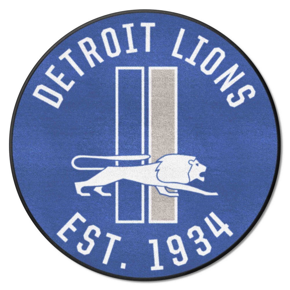 | Detroit Lions Roundel Rug - 27in. Diameter, NFL Vintage 9 Ounce, 100 % Nylon Face Recycled vinyl backing for a durable and longer-lasting product Machine made and tufted in the USA Non-skid backing with taped borders for added durability Machine washable; vacuum regularly and spot clean for any easy and quick clean Officially licensed and chromojet-printed in true team colors for vibrant, lasting color NFLV - Detroit Lions in Michigan NFL National Football League |