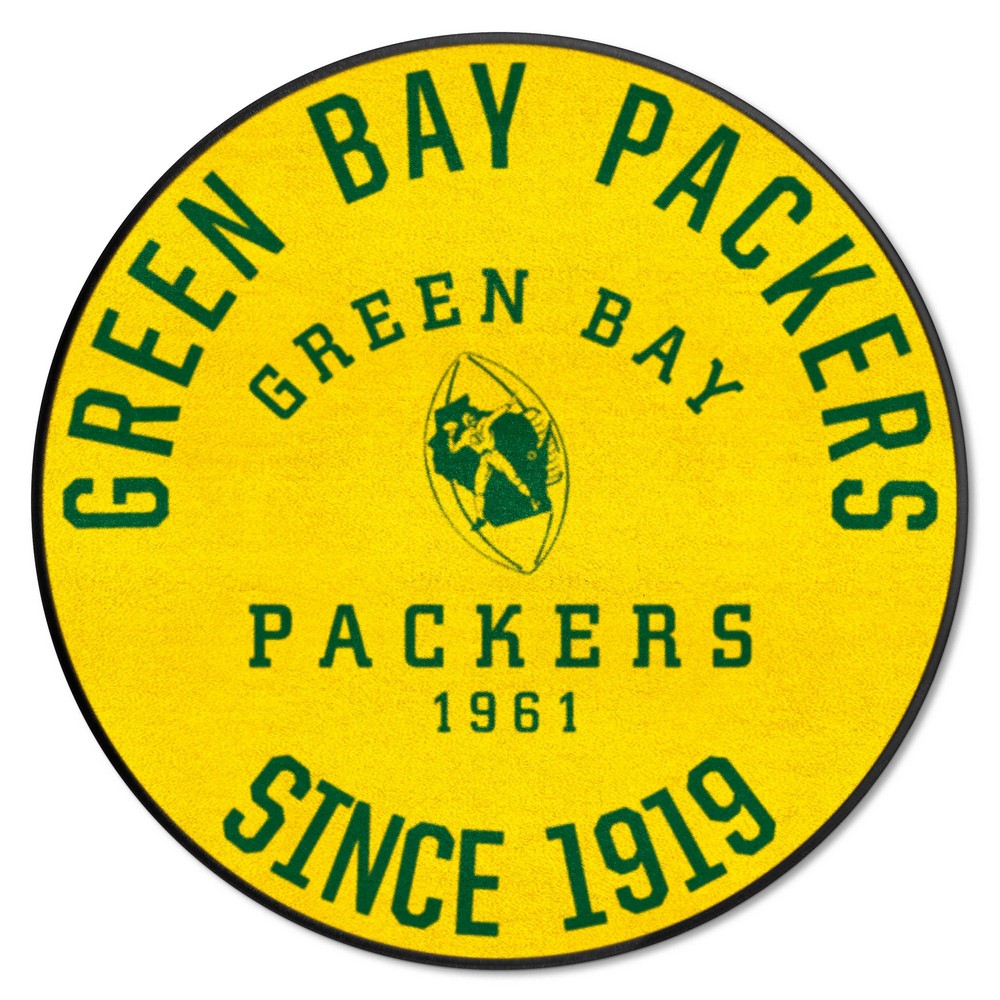 | Green Bay Packers Roundel Rug - 27in. Diameter, NFL Vintage 9 Ounce, 100 % Nylon Face Recycled vinyl backing for a durable and longer-lasting product Machine made and tufted in the USA Non-skid backing with taped borders for added durability Machine washable; vacuum regularly and spot clean for any easy and quick clean Officially licensed and chromojet-printed in true team colors for vibrant, lasting color NFLV - Green Bay Packers in Wisconsin NFL National Football League |