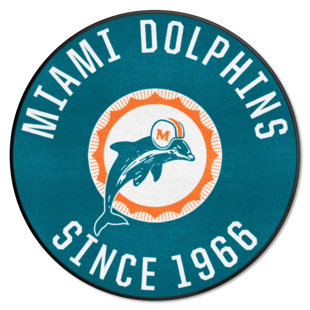| Miami Dolphins Roundel Rug - 27in. Diameter, NFL Vintage 9 Ounce, 100 % Nylon Face Recycled vinyl backing for a durable and longer-lasting product Machine made and tufted in the USA Non-skid backing with taped borders for added durability Machine washable; vacuum regularly and spot clean for any easy and quick clean Officially licensed and chromojet-printed in true team colors for vibrant, lasting color NFLV - Miami Dolphins in Florida NFL National Football League |