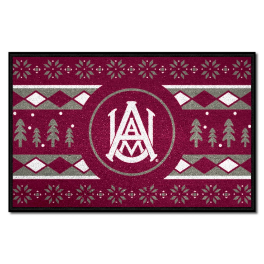 | Alabama A&M Bulldogs Holiday Sweater Starter Mat Accent Rug - 19in. x 30in. 9 Ounce, 100 % Nylon Face Recycled vinyl backing for a durable and longer-lasting product Machine made and tufted in the USA Non-skid backing with serged borders for added durability Machine washable; vacuum regularly and spot clean for any easy and quick clean Officially licensed and chromojet-printed in true team colors for vibrant, lasting color Alabama Agricultural & Mechanical University in Alabama |