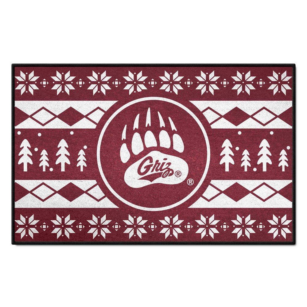 | Montana Grizzlies Holiday Sweater Starter Mat Accent Rug - 19in. x 30in. 9 Ounce, 100 % Nylon Face Recycled vinyl backing for a durable and longer-lasting product Machine made and tufted in the USA Non-skid backing with serged borders for added durability Machine washable; vacuum regularly and spot clean for any easy and quick clean Officially licensed and chromojet-printed in true team colors for vibrant, lasting color University of Montana in Montana |