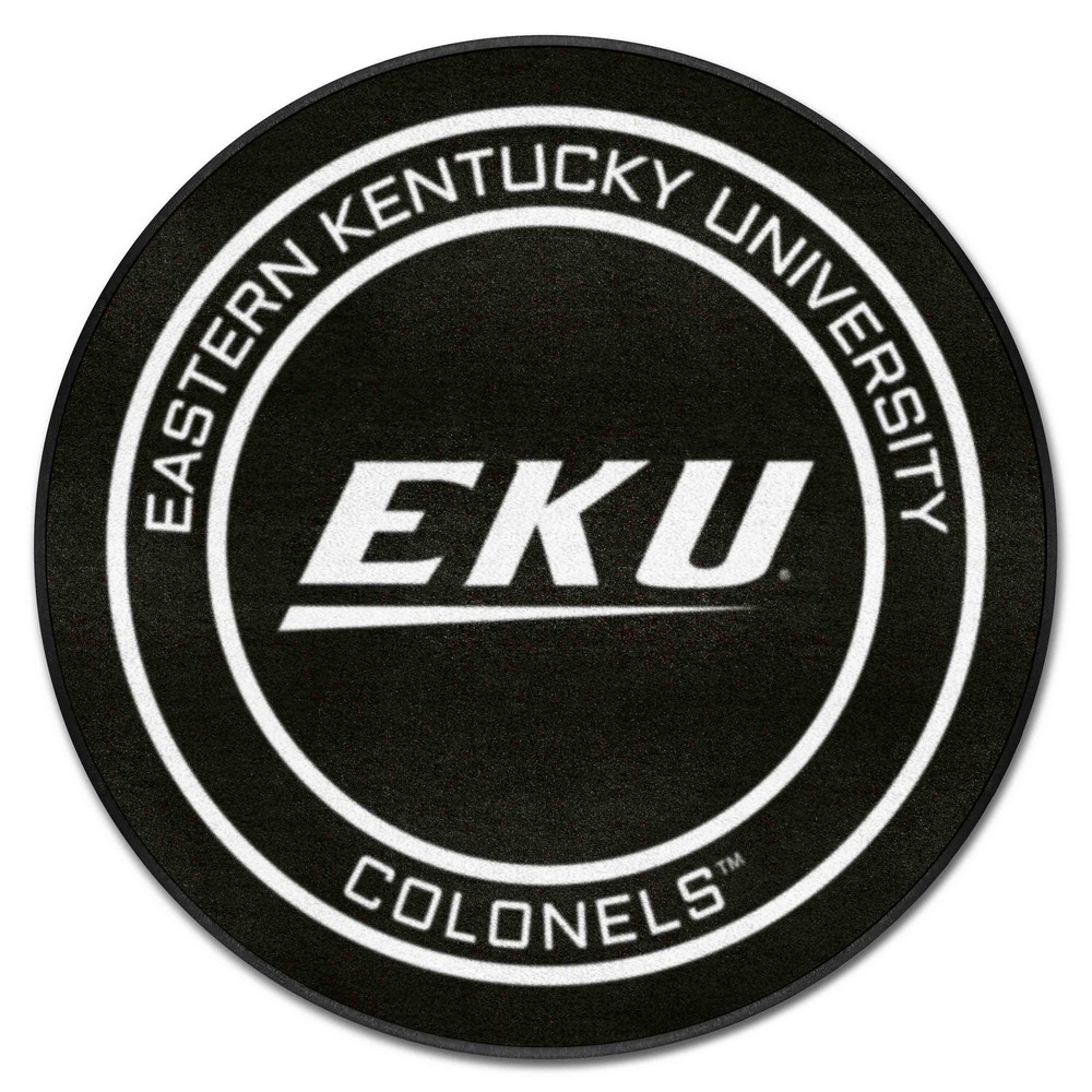 | Eastern Kentucky Hockey Puck Rug - 27in. Diameter 9 Ounce, 100 % Nylon Face Recycled vinyl backing for a durable and longer-lasting product Machine made and tufted in the USA Non-skid backing with taped borders for added durability Machine washable; vacuum regularly and spot clean for any easy and quick clean Officially licensed and chromojet-printed in true team colors for vibrant, lasting color Eastern Kentucky University in Kentucky |