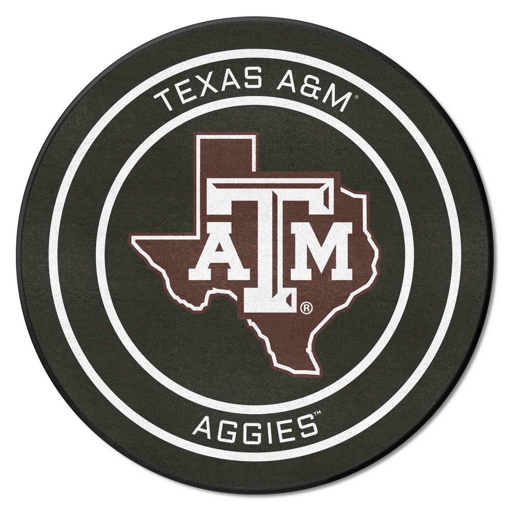 | Texas A&M Aggies Hockey Puck Rug - 27in. Diameter 9 Ounce, 100 % Nylon Face Recycled vinyl backing for a durable and longer-lasting product Machine made and tufted in the USA Non-skid backing with taped borders for added durability Machine washable; vacuum regularly and spot clean for any easy and quick clean Officially licensed and chromojet-printed in true team colors for vibrant, lasting color Texas A&M University in Texas |