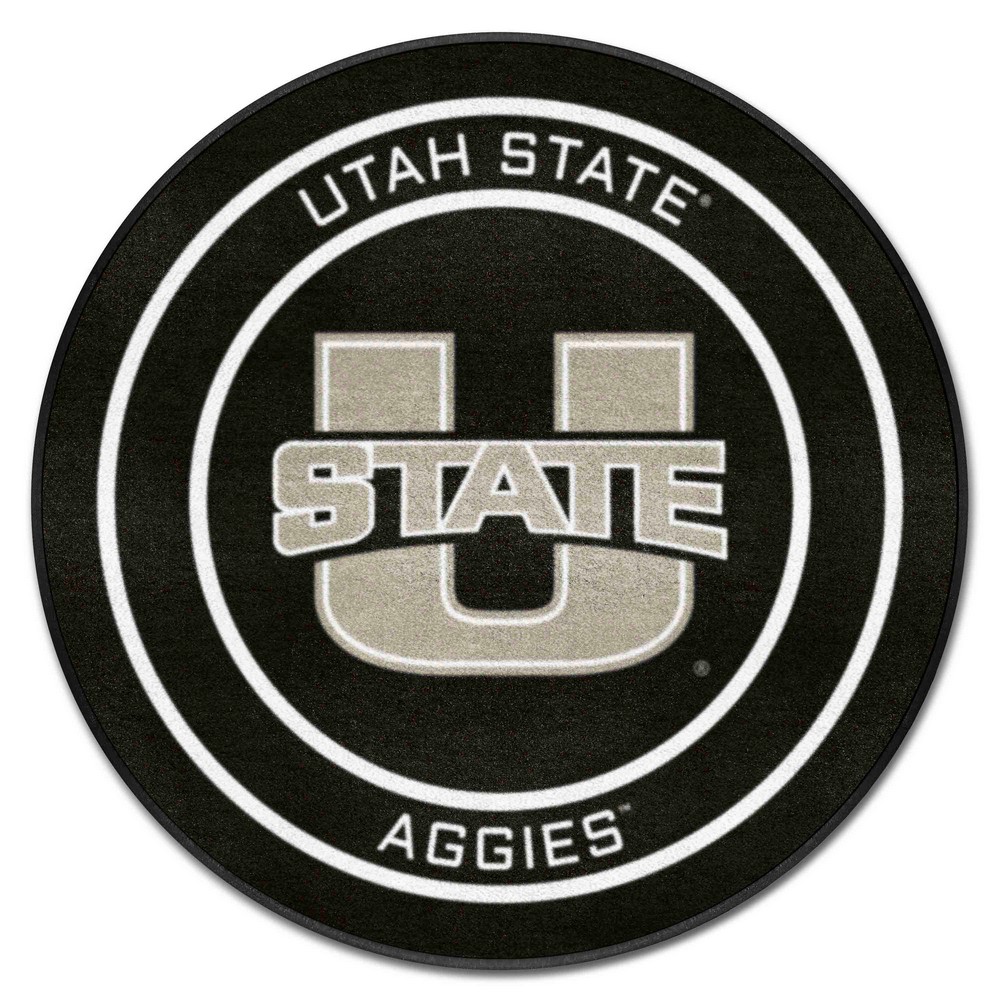 | Utah State Hockey Puck Rug - 27in. Diameter 9 Ounce, 100 % Nylon Face Recycled vinyl backing for a durable and longer-lasting product Machine made and tufted in the USA Non-skid backing with taped borders for added durability Machine washable; vacuum regularly and spot clean for any easy and quick clean Officially licensed and chromojet-printed in true team colors for vibrant, lasting color Utah State University in Utah |