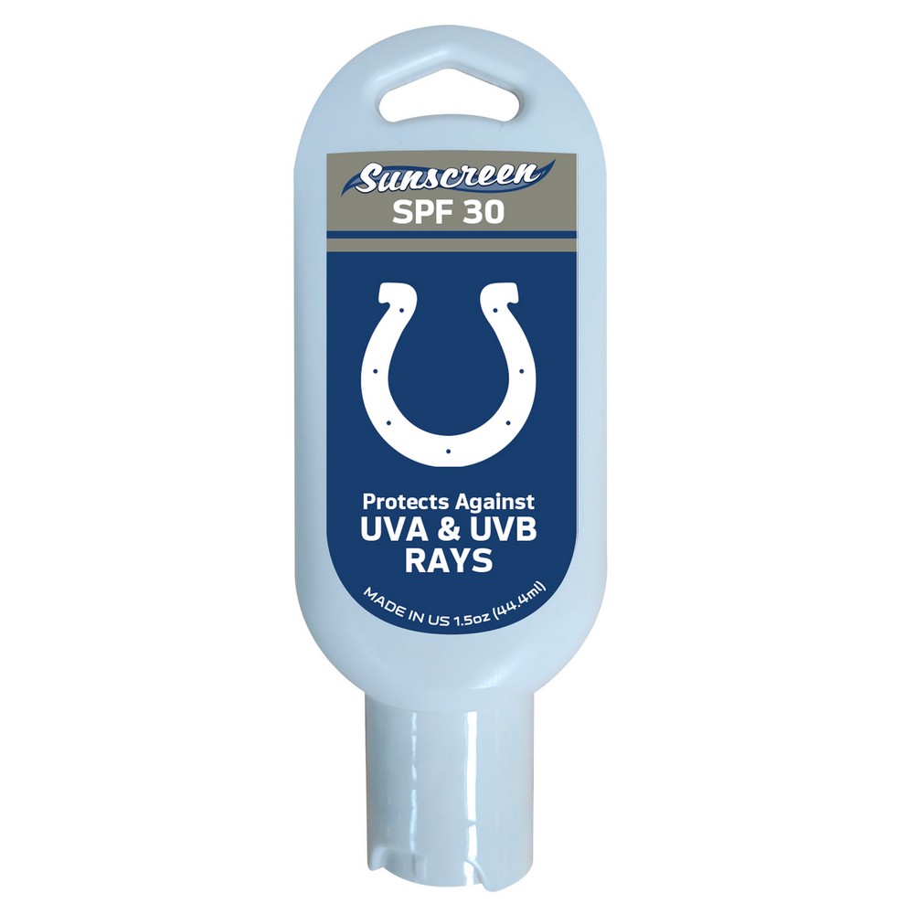 | Indianapolis Colts 1.5oz SPF 30 Sunscreen 1.5 oz (44.4mL) travel size Contains SPF 30 for protection against UVA & UVB rays Water and Sweat Resistant 80 Minutes Easy open pop-top Citrus-Coconut Scent Made in the USA NFL - Indianapolis Colts in Indiana NFL National Football League |