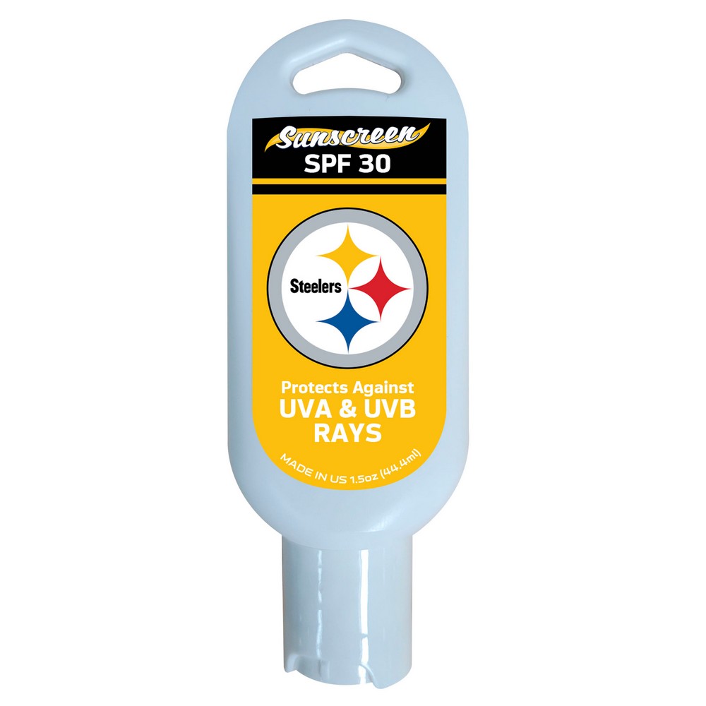 | Pittsburgh Steelers 1.5oz SPF 30 Sunscreen 1.5 oz (44.4mL) travel size Contains SPF 30 for protection against UVA & UVB rays Water and Sweat Resistant 80 Minutes Easy open pop-top Citrus-Coconut Scent Made in the USA NFL - Pittsburgh Steelers in Pennsylvania NFL National Football League |