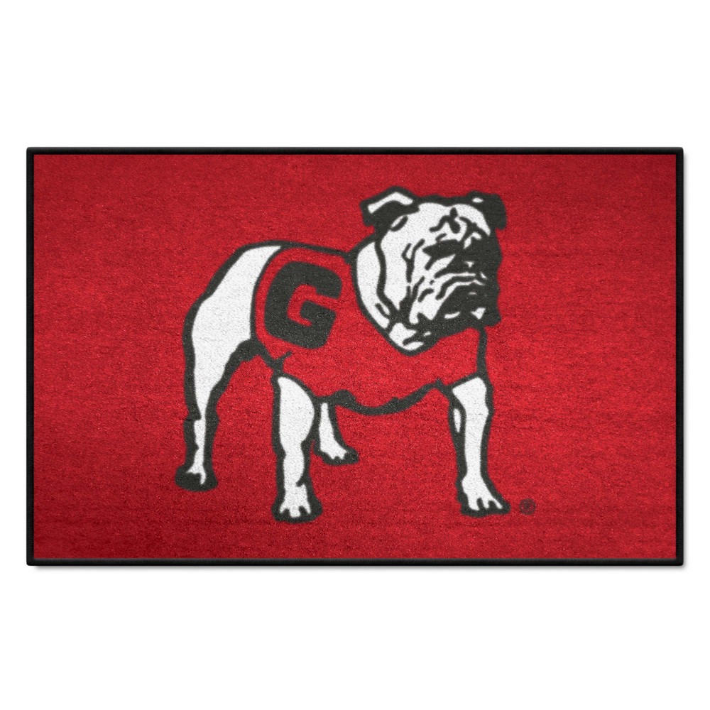 | Georgia Bulldogs Starter Mat Accent Rug - 19in. x 30in. 9 Ounce, 100 % Nylon Face Recycled vinyl backing for a durable and longer-lasting product Machine made and tufted in the USA Non-skid backing with serged borders for added durability Machine washable; vacuum regularly and spot clean for any easy and quick clean Officially licensed and chromojet-printed in true team colors for vibrant, lasting color University of Georgia in Georgia |