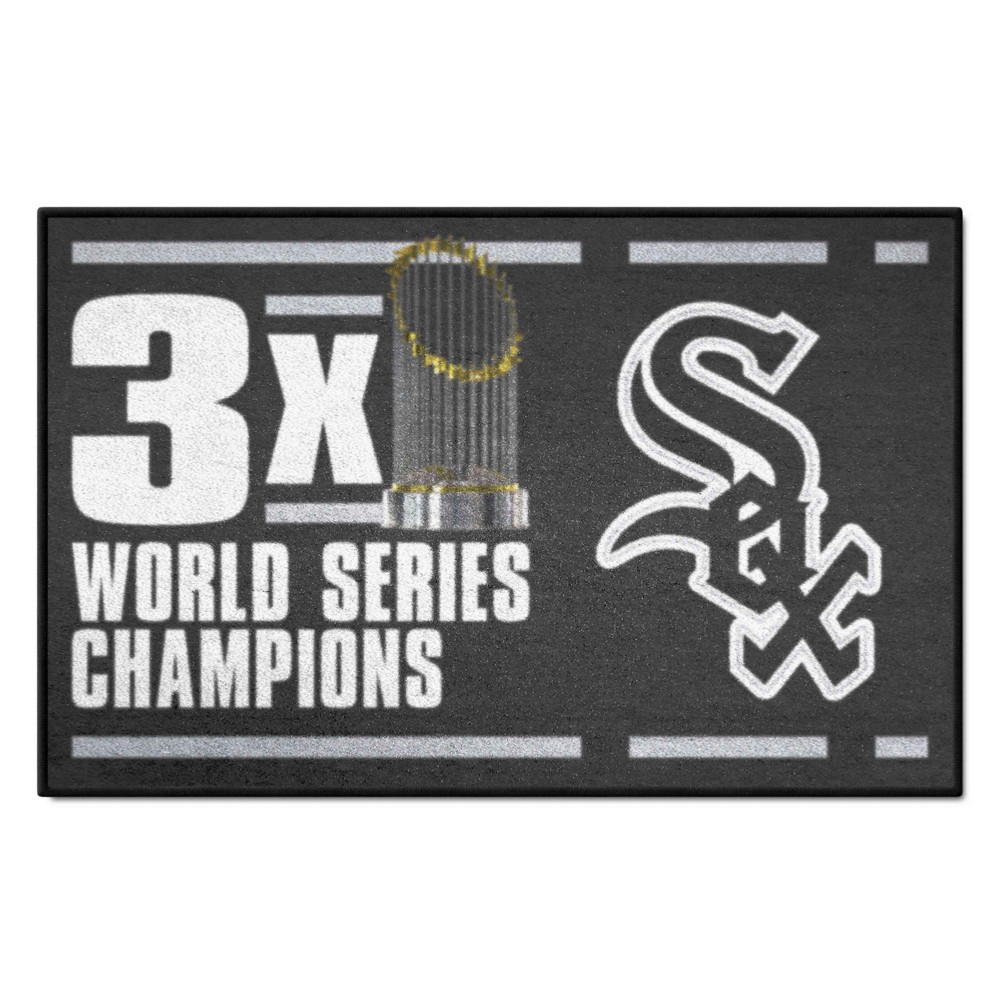 | Chicago White Sox Starter Mat Accent Rug - 19in. x 30in. 9 Ounce, 100 % Nylon Face Recycled vinyl backing for a durable and longer-lasting product Machine made and tufted in the USA Non-skid backing with serged borders for added durability Machine washable; vacuum regularly and spot clean for any easy and quick clean Officially licensed and chromojet-printed in true team colors for vibrant, lasting color MLB - Chicago White Sox in Illinois MLB Major League Baseball |