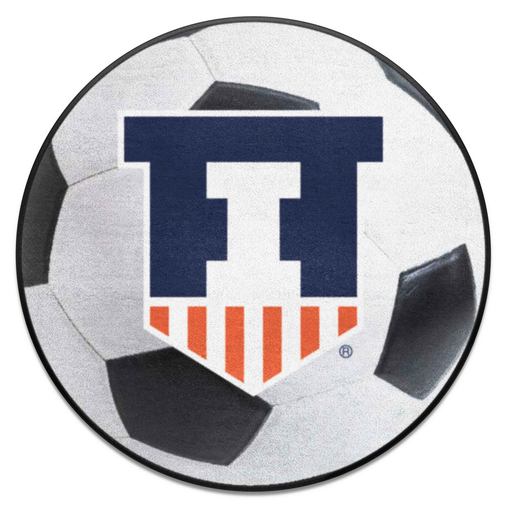 | Illinois Illini Soccer Ball Rug - 27in. Diameter 9 Ounce, 100 % Nylon Face Recycled vinyl backing for a durable and longer-lasting product Machine made and tufted in the USA Non-skid backing with taped borders for added durability Machine washable; vacuum regularly and spot clean for any easy and quick clean Officially licensed and chromojet-printed in true team colors for vibrant, lasting color University of Illinois in Illinois |