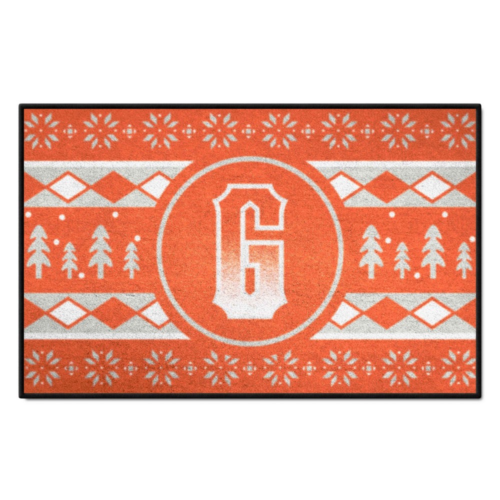 | San Francisco Giants Holiday Sweater Starter Mat Accent Rug - 19in. x 30in. 9 Ounce, 100 % Nylon Face Recycled vinyl backing for a durable and longer-lasting product Machine made and tufted in the USA Non-skid backing with serged borders for added durability Machine washable; vacuum regularly and spot clean for any easy and quick clean Officially licensed and chromojet-printed in true team colors for vibrant, lasting color MLB - San Francisco Giants in California MLB Major League Baseball |