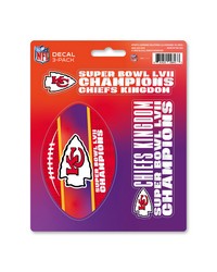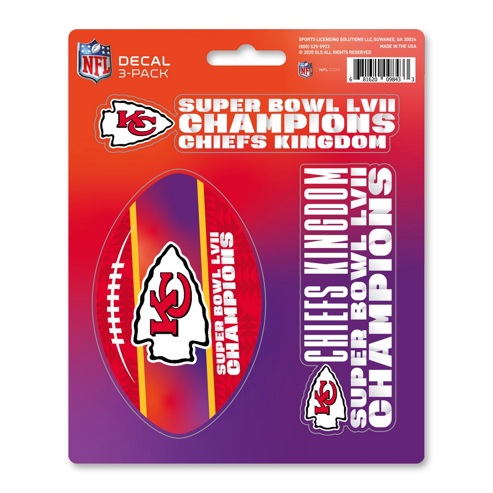 | Kansas City Chiefs Super Bowl LVII Decal 3-pk Includes 3 various size decals on a 5in x 6in sheet Adhesive decals are die-cut to shape Printed on premium vinyl material UV resistant lamination for outstanding durability Great for cars, laptops, coolers and other hard surfaces Approximately 5in x 6.25in NFL - Kansas City Chiefs in Missouri NFL National Football League |