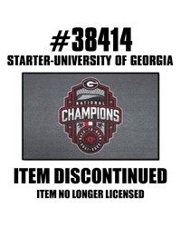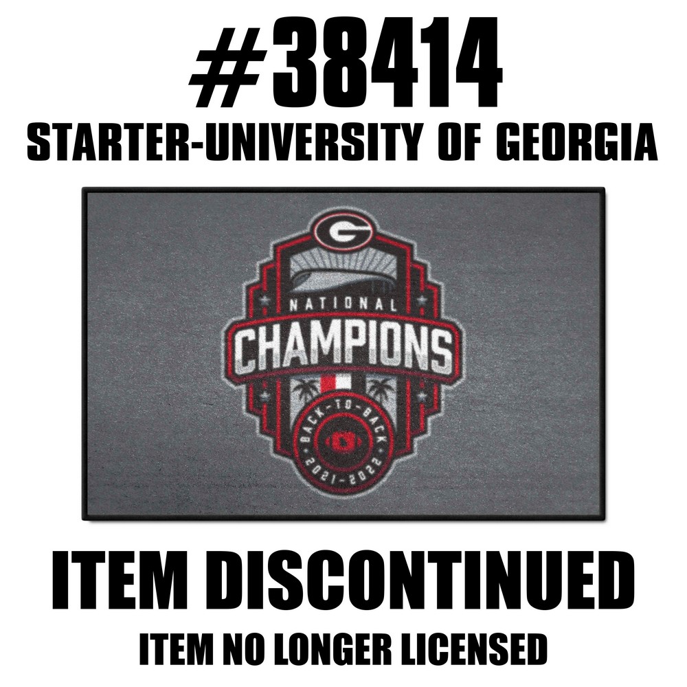 | Georgia 2022-23 National Champions Starter Mat 9 Ounce, 100 % Nylon Face Recycled vinyl backing for a durable and longer-lasting product Machine made and tufted in the USA Non-skid backing with serged borders for added durability Machine washable; vacuum regularly and spot clean for any easy and quick clean Officially licensed and chromojet-printed in true team colors for vibrant, lasting color University of Georgia in Georgia |
