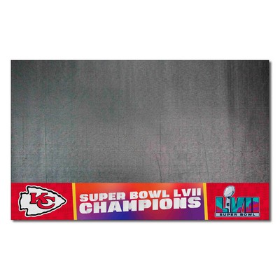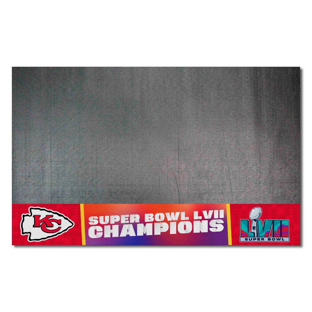 | Kansas City Chiefs Super Bowl LVII Grill Mat Made of 100% vinyl Universal size - fits under most grills Prevents spills from soaking in and staining Oil, flame, and UV resistant Non-skid surface keeps grill in place Easily cleaned with a water hose NFL - Kansas City Chiefs in Missouri NFL National Football League |