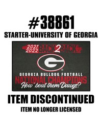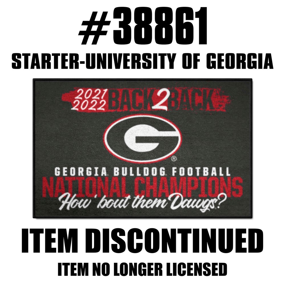 | Georgia Bulldogs Back to Back Champions Accent Rug - 19in. x 30in. 9 Ounce, 100 % Nylon Face Recycled vinyl backing for a durable and longer-lasting product Machine made and tufted in the USA Non-skid backing with serged borders for added durability Machine washable; vacuum regularly and spot clean for any easy and quick clean Officially licensed and chromojet-printed in true team colors for vibrant, lasting color University of Georgia in Georgia |