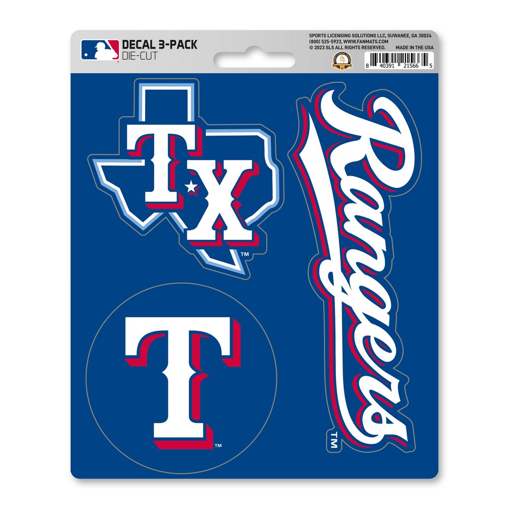 | Texas Rangers 3 Piece Decal Sticker Set Includes 3 various size decals on a 5in x 6in sheet Adhesive decals are die-cut to shape Printed on premium vinyl material UV resistant lamination for outstanding durability Great for cars, laptops, coolers and other hard surfaces Approximately 5in x 6.25in MLB - Texas Rangers in Texas MLB Major League Baseball |