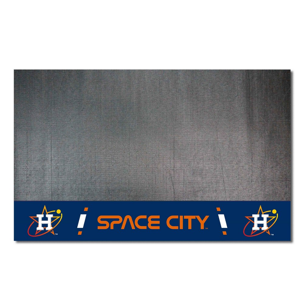 | Houston Astros Vinyl Grill Mat - 26in. x 42in. Made of 100% vinyl Universal size - fits under most grills Prevents spills from soaking in and staining Oil, flame, and UV resistant Non-skid surface keeps grill in place Easily cleaned with a water hose MLB - Houston Astros in Texas MLB Major League Baseball |