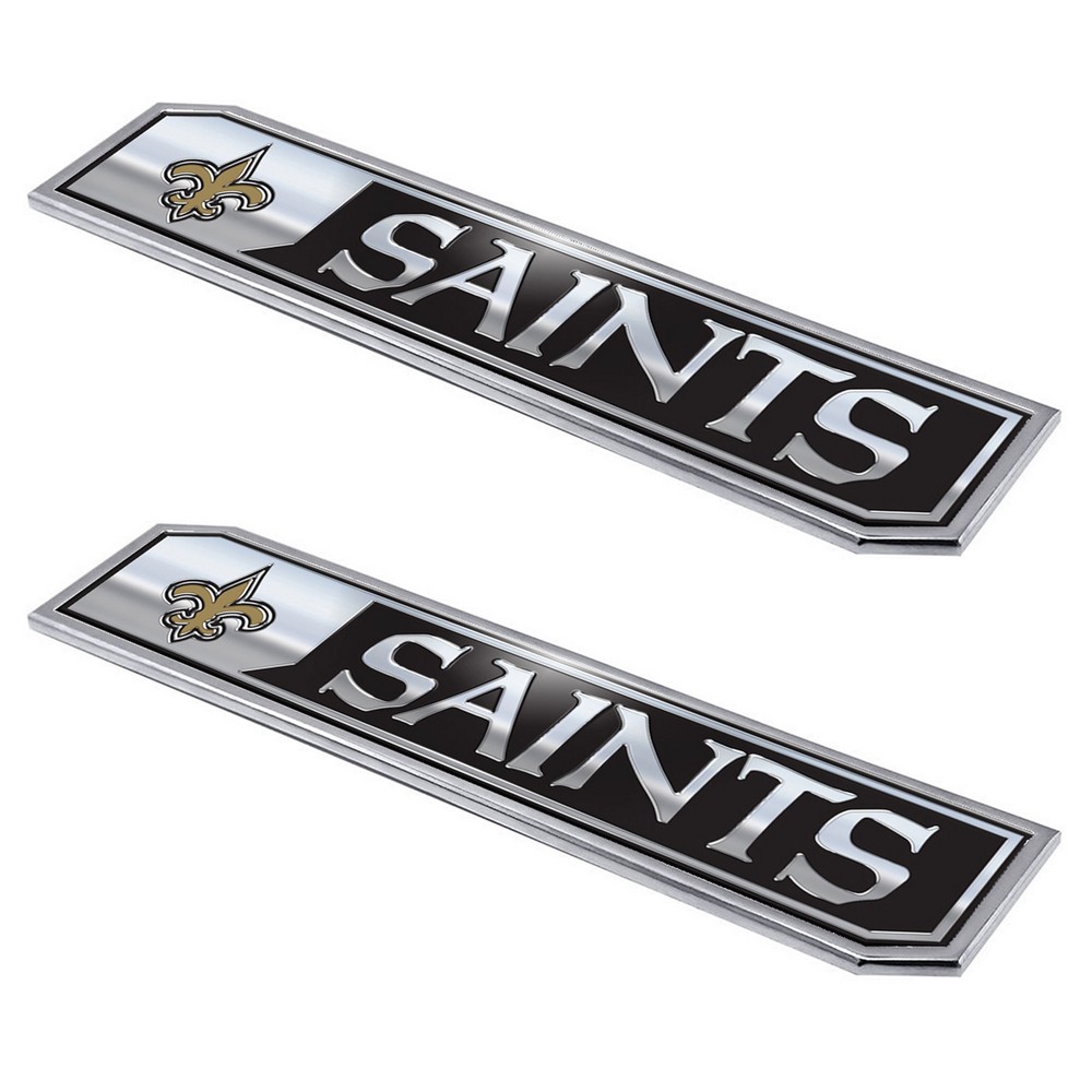 | New Orleans Saints 2 Piece Heavy Duty Aluminum Embossed Truck Emblem Set Comes in a 2-Pack Set Rectangular in Shape with Unique Angles Designed to Compliment Any Truck or Car Features Team Colored Logo and Raised Team Wordmark Easy application with full auto adhesive backing Made with corrosion resistant aluminum Approximately 1.75in x 8.25in NFL - New Orleans Saints in Louisiana NFL National Football League |