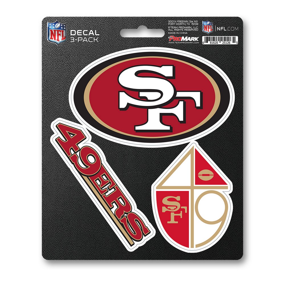 | San Francisco 49ers 3 Piece Decal Sticker Set Includes 3 various size decals on a 5in x 6in sheet Adhesive decals are die-cut to shape Printed on premium vinyl material UV resistant lamination for outstanding durability Great for cars, laptops, coolers and other hard surfaces Approximately 5in x 6.25in NFL - San Francisco 49ers in California NFL National Football League |