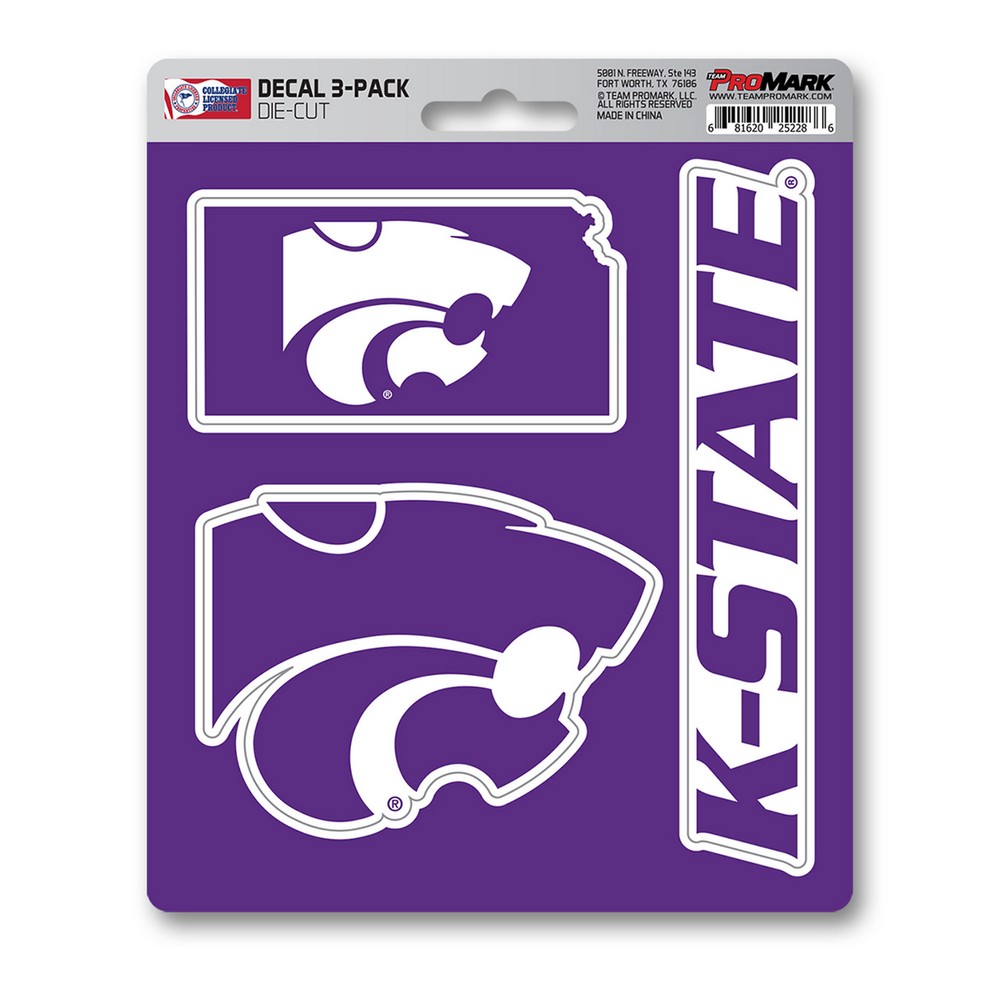 | Kansas State Wildcats 3 Piece Decal Sticker Set Includes 3 various size decals on a 5in x 6in sheet Adhesive decals are die-cut to shape Printed on premium vinyl material UV resistant lamination for outstanding durability Great for cars, laptops, coolers and other hard surfaces Approximately 5in x 6.25in Kansas State University in Kansas |