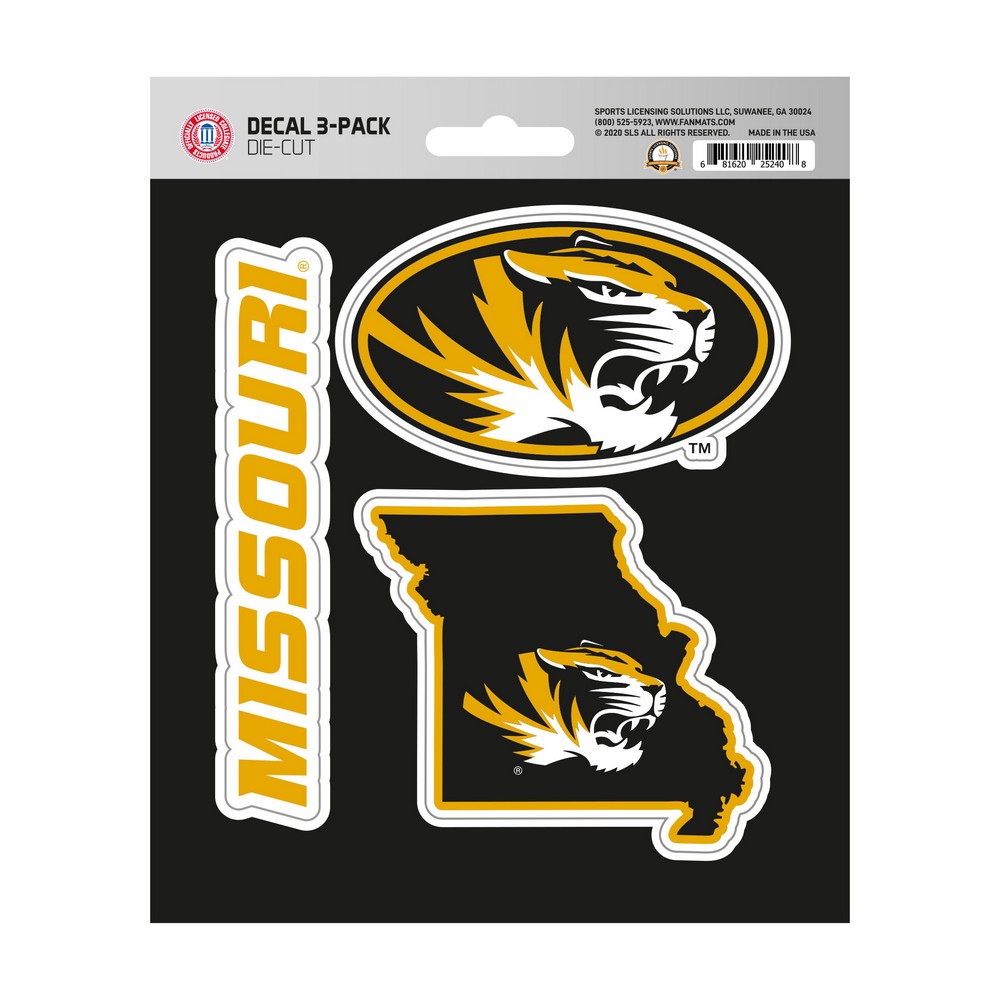 | Missouri Tigers 3 Piece Decal Sticker Set Includes 3 various size decals on a 5in x 6in sheet Adhesive decals are die-cut to shape Printed on premium vinyl material UV resistant lamination for outstanding durability Great for cars, laptops, coolers and other hard surfaces Approximately 5in x 6.25in University of Missouri in Missouri |