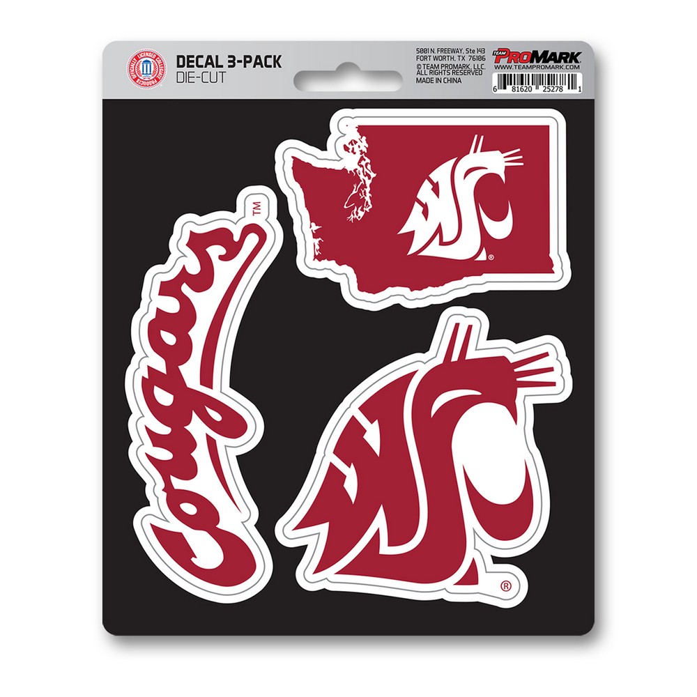 | Washington State Cougars 3 Piece Decal Sticker Set Includes 3 various size decals on a 5in x 6in sheet Adhesive decals are die-cut to shape Printed on premium vinyl material UV resistant lamination for outstanding durability Great for cars, laptops, coolers and other hard surfaces Approximately 5in x 6.25in Washington State University in Washington |