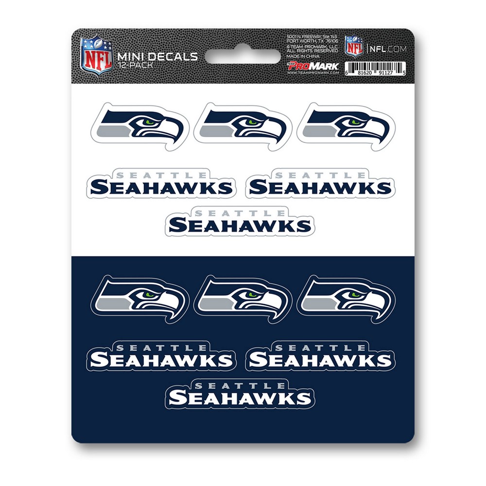 | Seattle Seahawks 12 Count Mini Decal Sticker Pack Includes12 small size decals on a 5in x 6in sheet Adhesive decals are die-cut to shape Printed on premium vinyl material UV resistant lamination for outstanding durability Great for cars, laptops, coolers and other hard surfaces Approximately 5in x 6.25in NFL - Seattle Seahawks in Washington NFL National Football League |