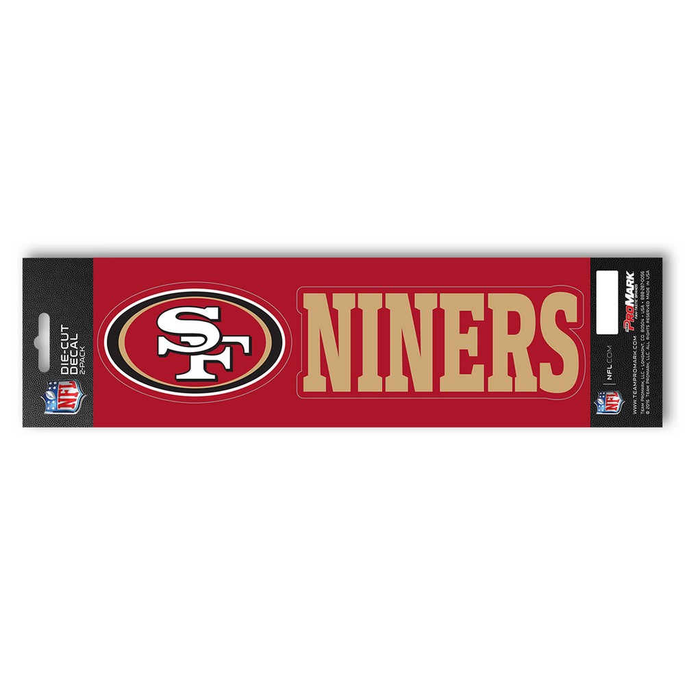 | San Francisco 49ers 2 Piece Team Slogan Decal Sticker Set Decal pack includes 1 slogan and 1 logo decal Adhesive decals are die-cut to shape Printed on premium vinyl material UV resistant lamination for outstanding durability Great for cars, laptops, coolers and other hard surfaces Approximately 5in x 6.25in NFL - San Francisco 49ers in California NFL National Football League |