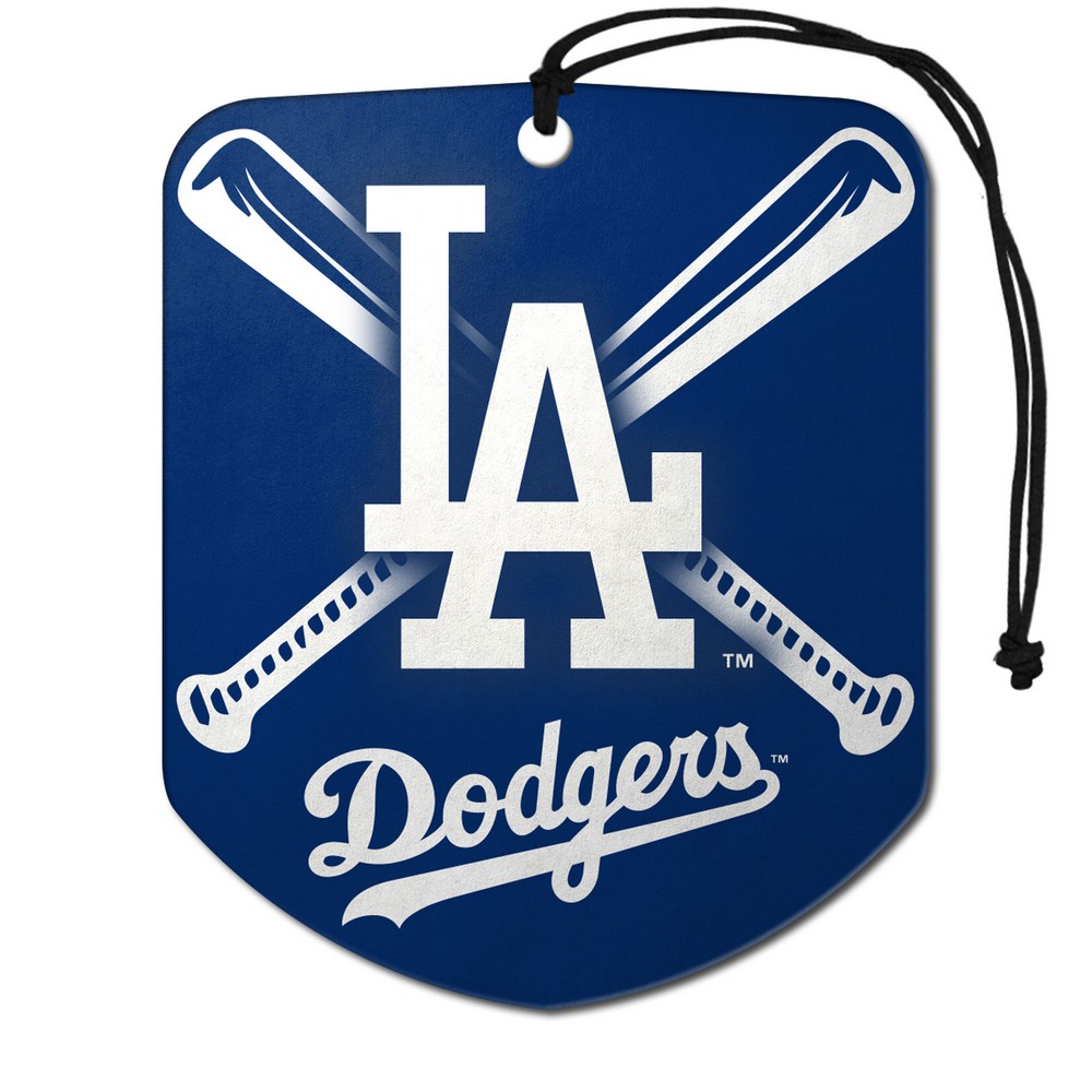 | Los Angeles Dodgers 2 Pack Air Freshener Long lasting fresh scent Double sided full color team design includes a bungee string for hanging in your car easily. Includes 2 individually wrapped air fresheners Perfect addition to any vehicle Approximately 2.75in x 3.5in MLB - Los Angeles Dodgers in California MLB Major League Baseball |