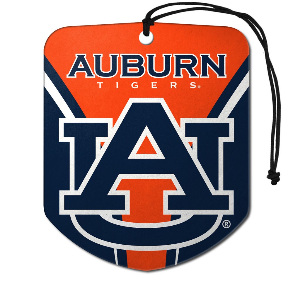 | Auburn Tigers 2 Pack Air Freshener Long lasting fresh scent Double sided full color team design includes a bungee string for hanging in your car easily. Includes 2 individually wrapped air fresheners Perfect addition to any vehicle Approximately 2.75in x 3.5in Auburn University in Alabama |