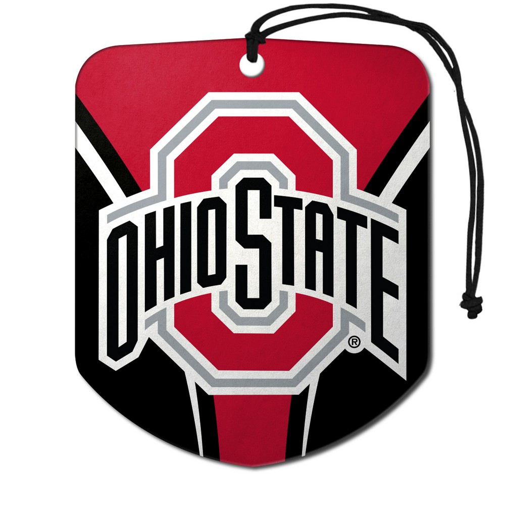 | Ohio State Buckeyes 2 Pack Air Freshener Long lasting fresh scent Double sided full color team design includes a bungee string for hanging in your car easily. Includes 2 individually wrapped air fresheners Perfect addition to any vehicle Approximately 2.75in x 3.5in Ohio State University in Ohio |