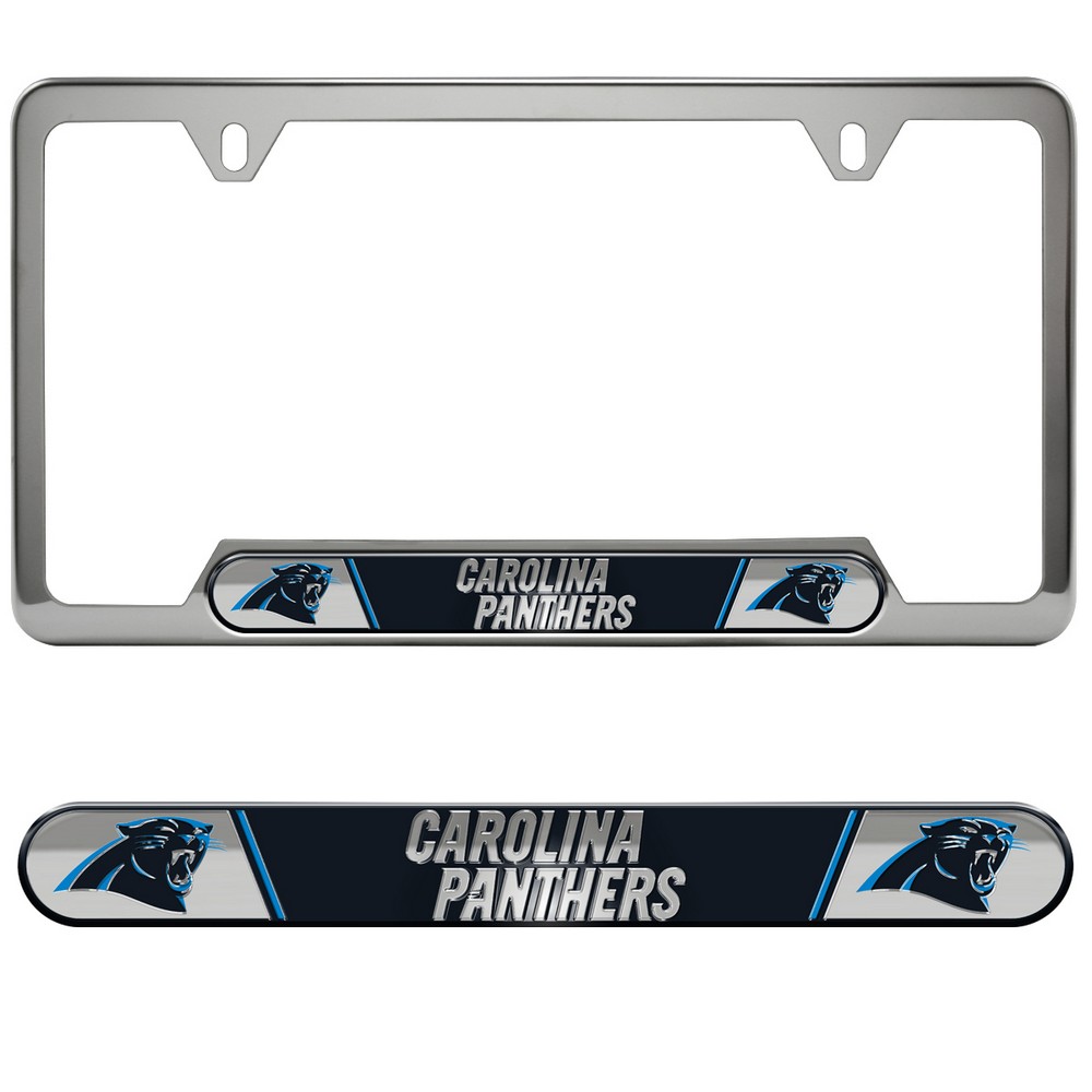 | Carolina Panthers Embossed License Plate Frame, 6.25in x 12.25in Frame fits all standard license plates. Durable Polished stainless steel frame with team logo on embossed aluminum inserts. Comes with pre-drilled holes on top for mounting on your vehicle. Slim line design helps keep registration sticker visible Universal design compliment in all states Approximate size 12.25in x 6.25in NFL - Carolina Panthers in North Carolina NFL National Football League |