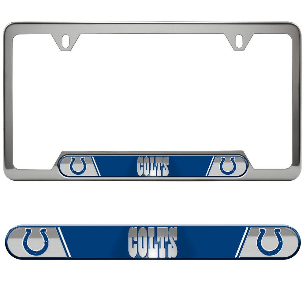 | Indianapolis Colts Embossed License Plate Frame, 6.25in x 12.25in Frame fits all standard license plates. Durable Polished stainless steel frame with team logo on embossed aluminum inserts. Comes with pre-drilled holes on top for mounting on your vehicle. Slim line design helps keep registration sticker visible Universal design compliment in all states Approximate size 12.25in x 6.25in NFL - Indianapolis Colts in Indiana NFL National Football League |