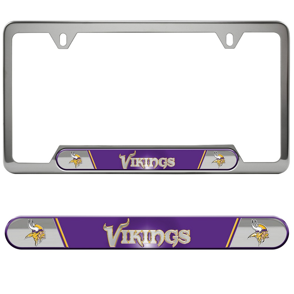 | Minnesota Vikings Embossed License Plate Frame, 6.25in x 12.25in Frame fits all standard license plates. Durable Polished stainless steel frame with team logo on embossed aluminum inserts. Comes with pre-drilled holes on top for mounting on your vehicle. Slim line design helps keep registration sticker visible Universal design compliment in all states Approximate size 12.25in x 6.25in NFL - Minnesota Vikings in Minnesota NFL National Football League |