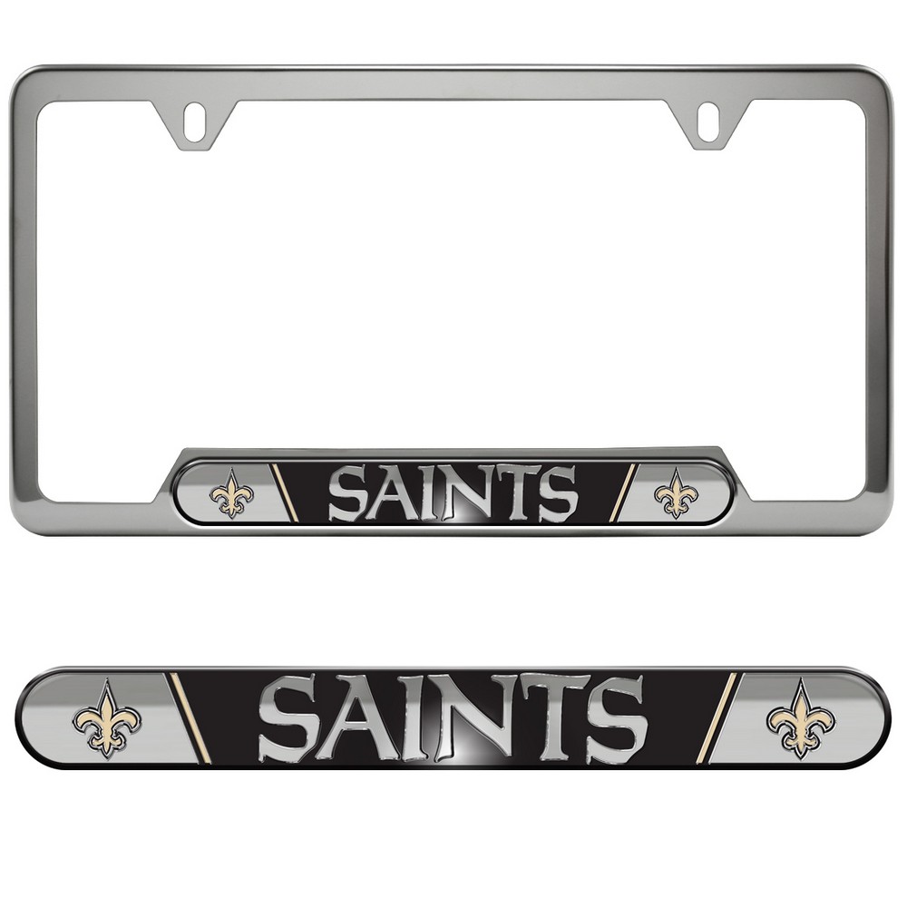 | New Orleans Saints Embossed License Plate Frame, 6.25in x 12.25in Frame fits all standard license plates. Durable Polished stainless steel frame with team logo on embossed aluminum inserts. Comes with pre-drilled holes on top for mounting on your vehicle. Slim line design helps keep registration sticker visible Universal design compliment in all states Approximate size 12.25in x 6.25in NFL - New Orleans Saints in Louisiana NFL National Football League |