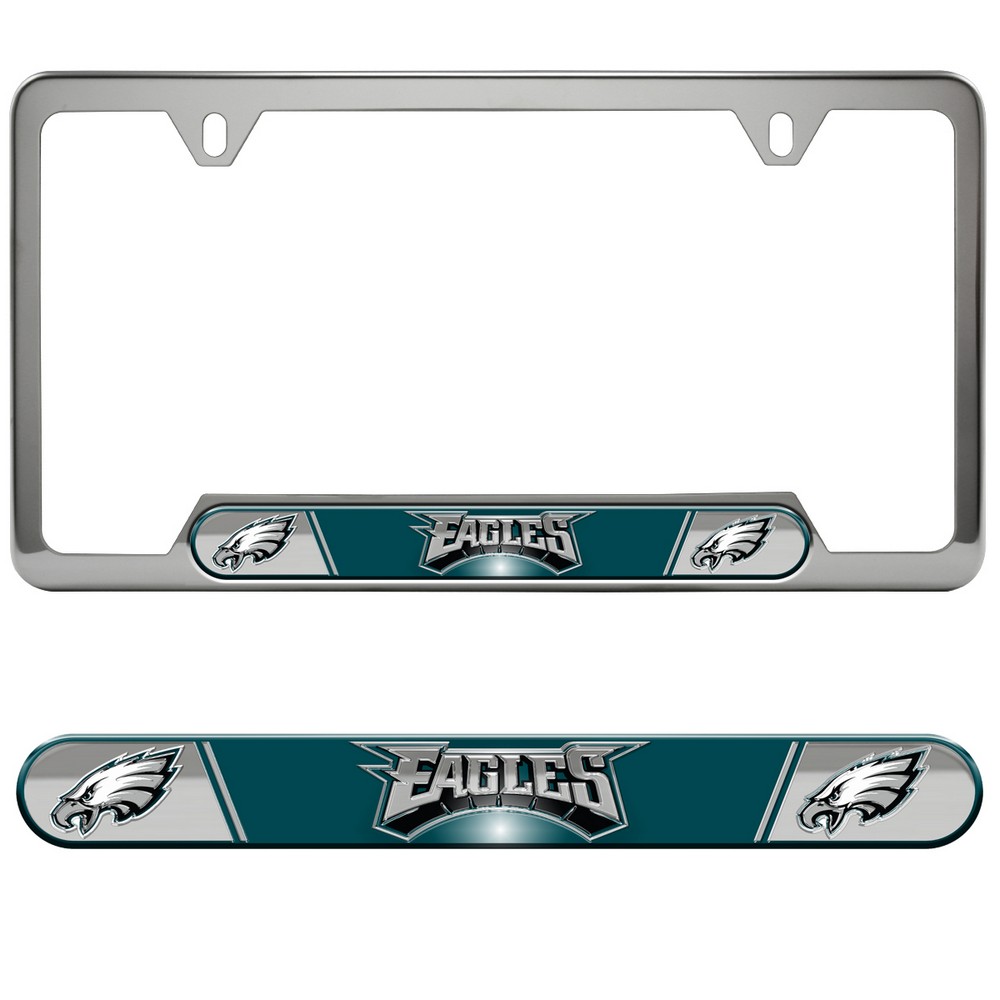 | Philadelphia Eagles Embossed License Plate Frame, 6.25in x 12.25in Frame fits all standard license plates. Durable Polished stainless steel frame with team logo on embossed aluminum inserts. Comes with pre-drilled holes on top for mounting on your vehicle. Slim line design helps keep registration sticker visible Universal design compliment in all states Approximate size 12.25in x 6.25in NFL - Philadelphia Eagles in Pennsylvania NFL National Football League |