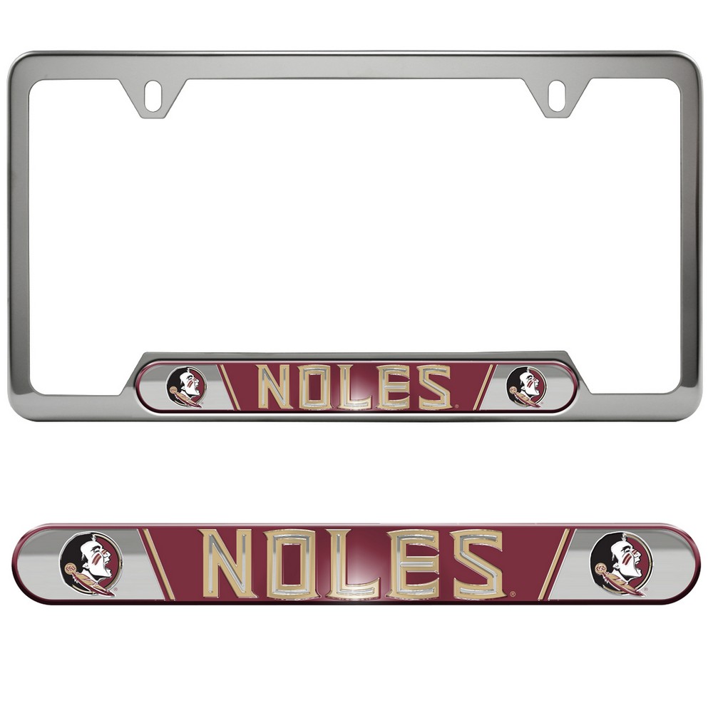 | Florida State Seminoles Embossed License Plate Frame, 6.25in x 12.25in Frame fits all standard license plates. Durable Polished stainless steel frame with team logo on embossed aluminum inserts. Comes with pre-drilled holes on top for mounting on your vehicle. Slim line design helps keep registration sticker visible Universal design compliment in all states Approximate size 12.25in x 6.25in Florida State University in Florida |