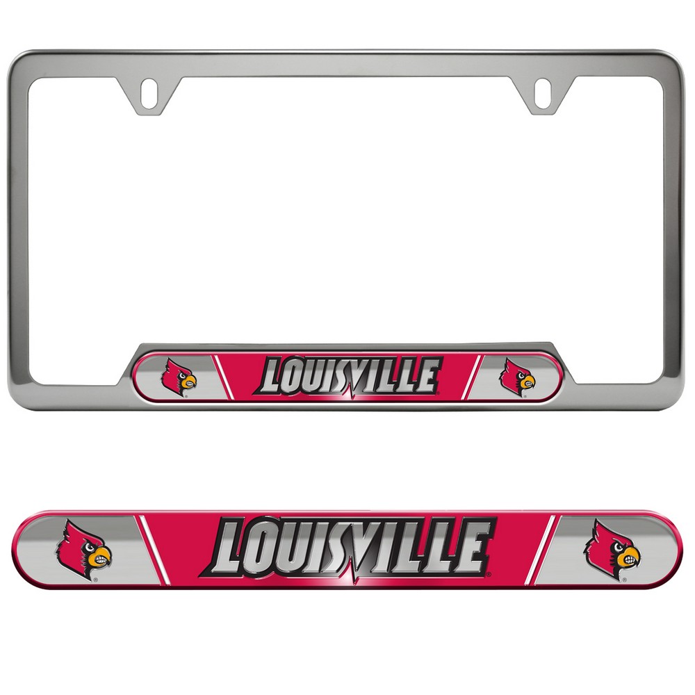 | Louisville Cardinals Embossed License Plate Frame, 6.25in x 12.25in Frame fits all standard license plates. Durable Polished stainless steel frame with team logo on embossed aluminum inserts. Comes with pre-drilled holes on top for mounting on your vehicle. Slim line design helps keep registration sticker visible Universal design compliment in all states Approximate size 12.25in x 6.25in University of Louisville in Kentucky |