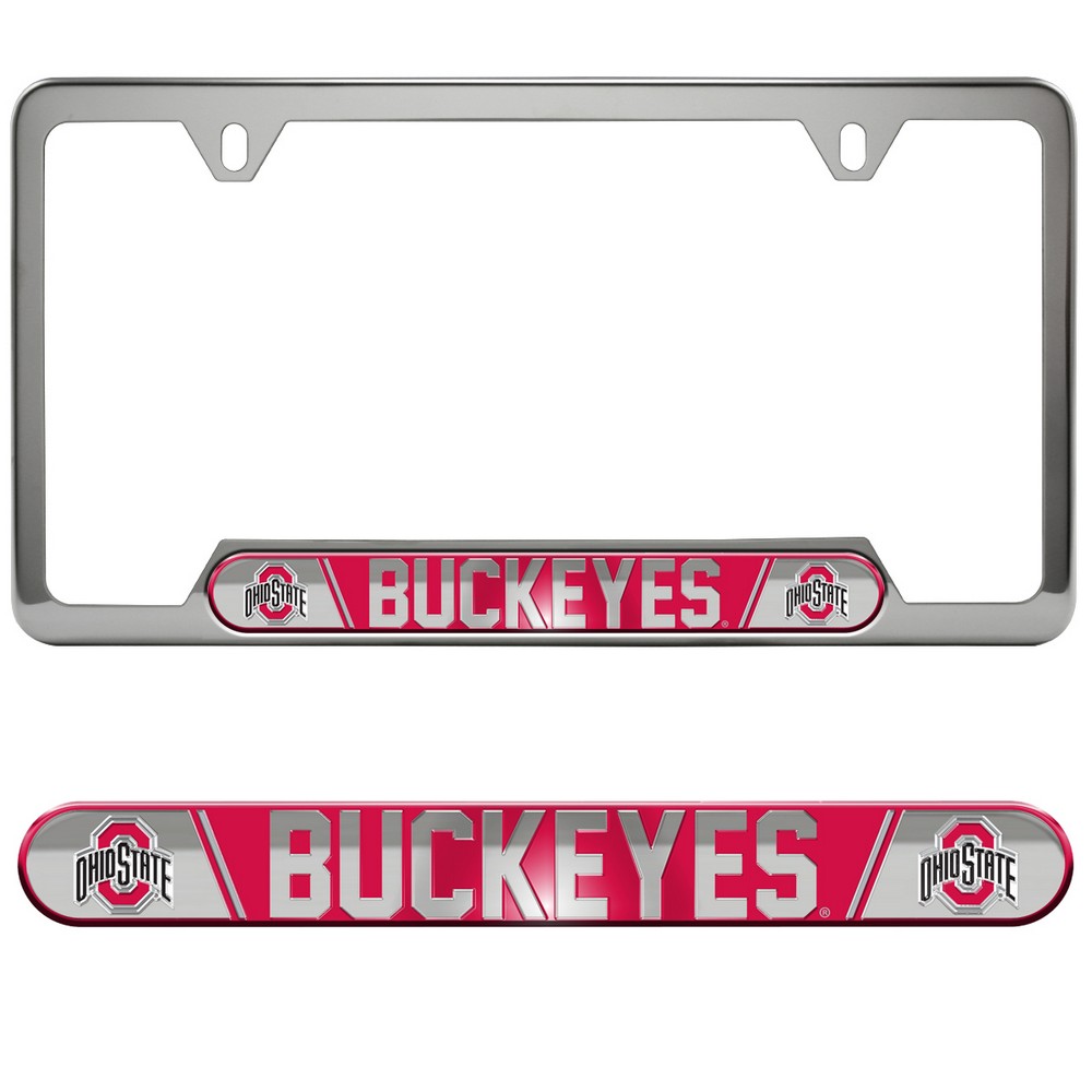 | Ohio State Buckeyes Embossed License Plate Frame, 6.25in x 12.25in Frame fits all standard license plates. Durable Polished stainless steel frame with team logo on embossed aluminum inserts. Comes with pre-drilled holes on top for mounting on your vehicle. Slim line design helps keep registration sticker visible Universal design compliment in all states Approximate size 12.25in x 6.25in Ohio State University in Ohio |