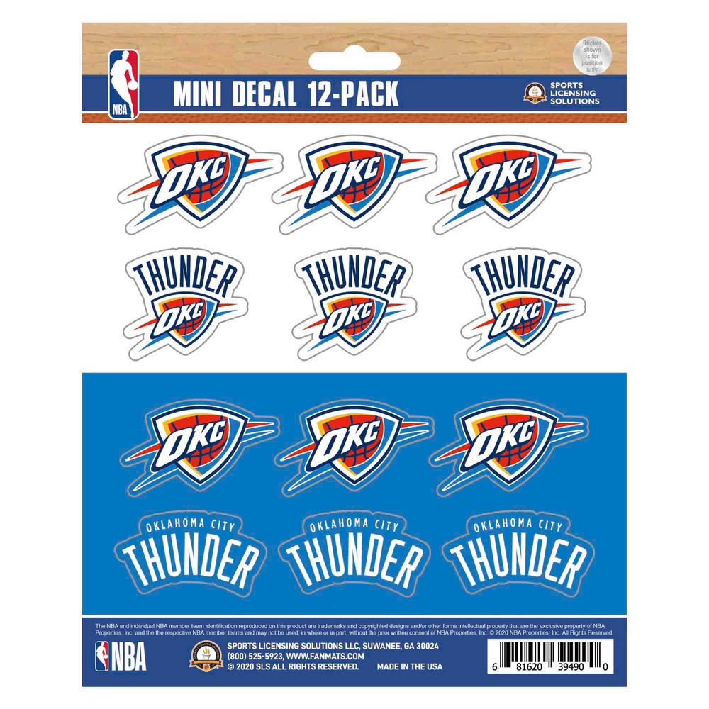 | Oklahoma City Thunder 12 Count Mini Decal Sticker Pack Includes12 small size decals on a 5in x 6in sheet Adhesive decals are die-cut to shape Printed on premium vinyl material UV resistant lamination for outstanding durability Great for cars, laptops, coolers and other hard surfaces Approximately 5in x 6.25in NBA - Oklahoma City Thunder in Oklahoma NBA National Basketball Association |