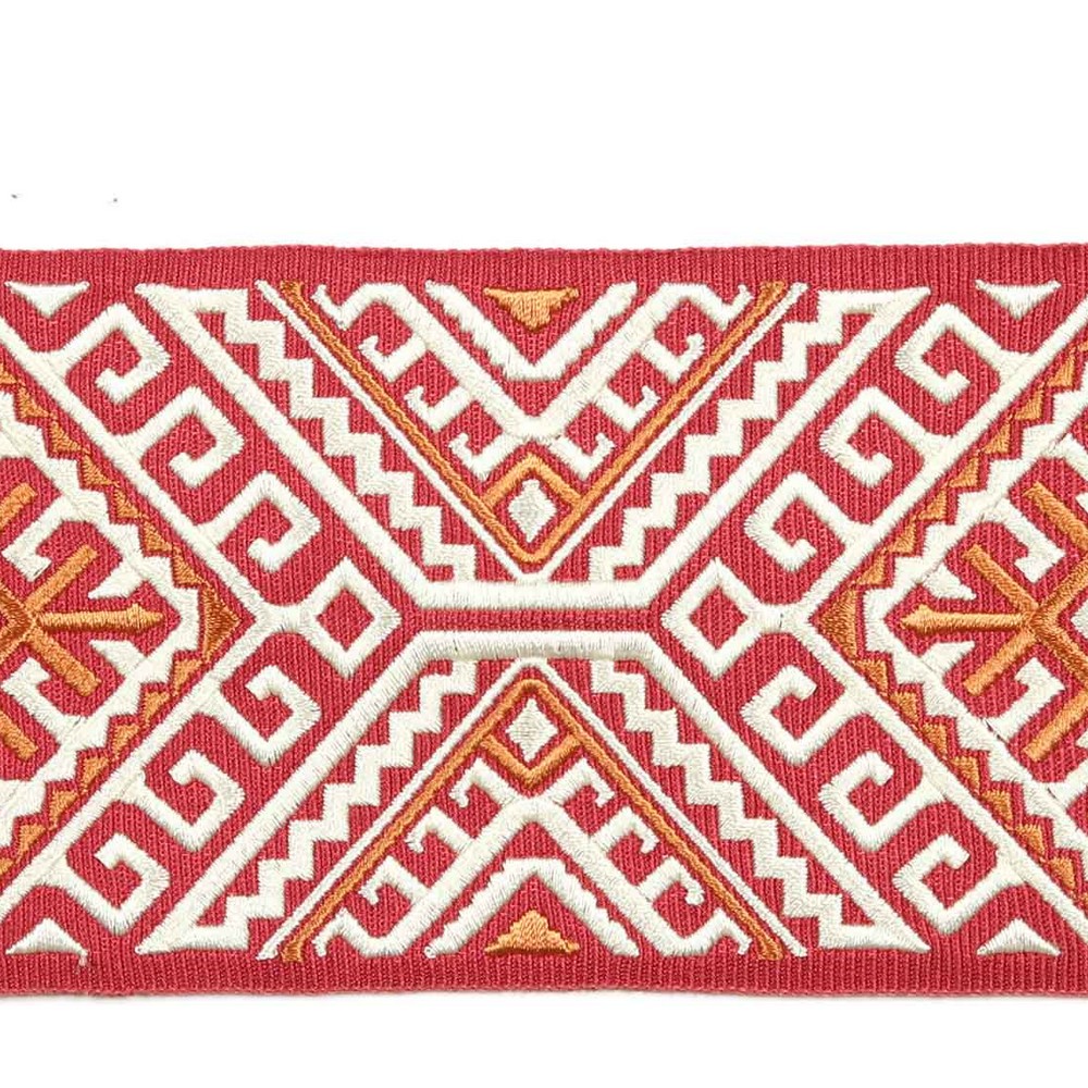 | Wide width fabric trim borders that you will have to see to believe. Beautiful colors and embroidery make this fabric tape perfect for trimming drapes, pillows and so much more. Red with orange and white southwestern design. |