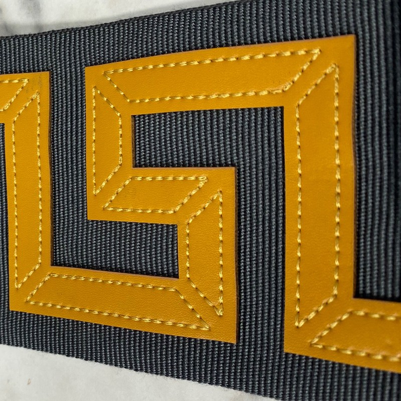 | Ridged fabric tape with faux leather accents. Greek Key style pattern. |