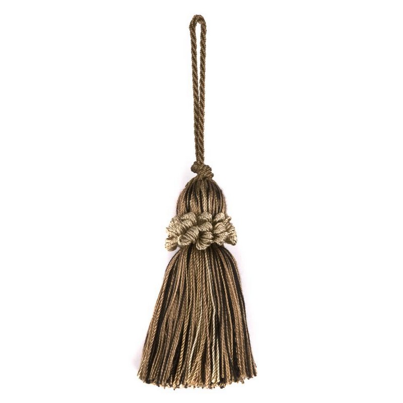 | Kasmir Trim Essentials Colors: Brown Key Tassel Kasmir Exclusive Rope Diameter: 1/16 Inches Overall Tassel Body:3 4/16 Inches Total Length:5 14/16 Inches Tassel Diameter:1 Inches |