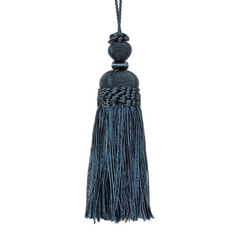 | Kasmir Trim Essentials Colors: Blue Gray Key Tassel Kasmir Exclusive Rope Diameter: 1/16 Inches Overall Tassel Body:6 4/16 Inches |