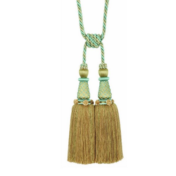 Bergamo Trim Collection Tassel Rope: 20in Tassel Body: 11.5in Overall Size: 21.5in Color includes aqua, gold and cream. |