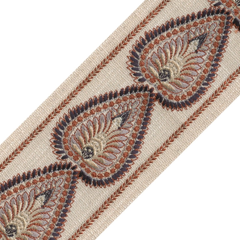 | Introduce a bold yet refined accent with this wide embroidered fabric tape, featuring a leafy stripe that frames a repeating triangle paisley motif. Crafted from a polyester-cotton blend, its rustic woven texture adds depth and character to any setting. Ideal for trimming pillows, furniture, shades, and draperies, this decorative tape blends botanical elegance with geometric flair. |