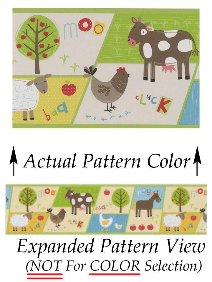 | An darling farm border for kids rooms! A day on the farm arranged in a patchwork design with polka dots and animal sounds. Pre-pasted, just wet and hang. Scrubbable and peelable. 1 spool measures 6 13/16"H x 5 yards long. |