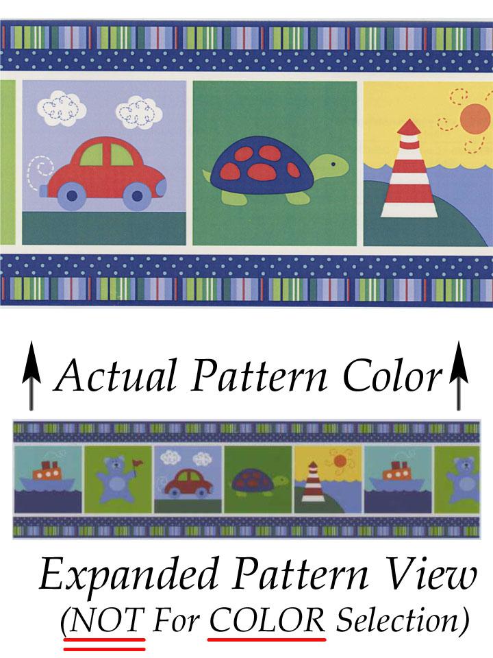 | Kids border with a light house, turtle, tug boat, and car, are arranged on ribbon candy and polka dots. Blue, green, yellow and red. Pre-pasted, just wet and hang. Scrubbable and peelable. 1 spool measures 6"H x 5 yards long. |