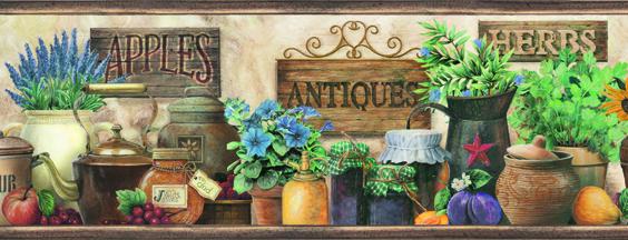| Potted plants herbs and flowers feature vivid colors in this shabby hip decor. Wooden antique signs for apples herbs and antiques would look charming in any country home. Page: 54 Roll Width (in): 6 Roll Length (ft): 15 Prepasted Strippable |